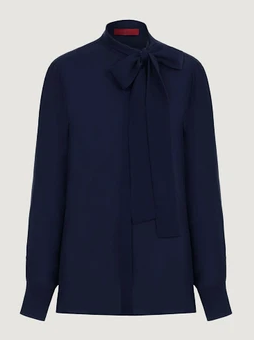 Mossy Oak Wide Leg Trousers + Printed Navy Blue Blouse + Scarf or a classic Poplin Shirt with a print scarf + pastel pumps